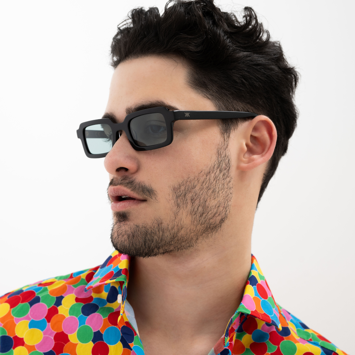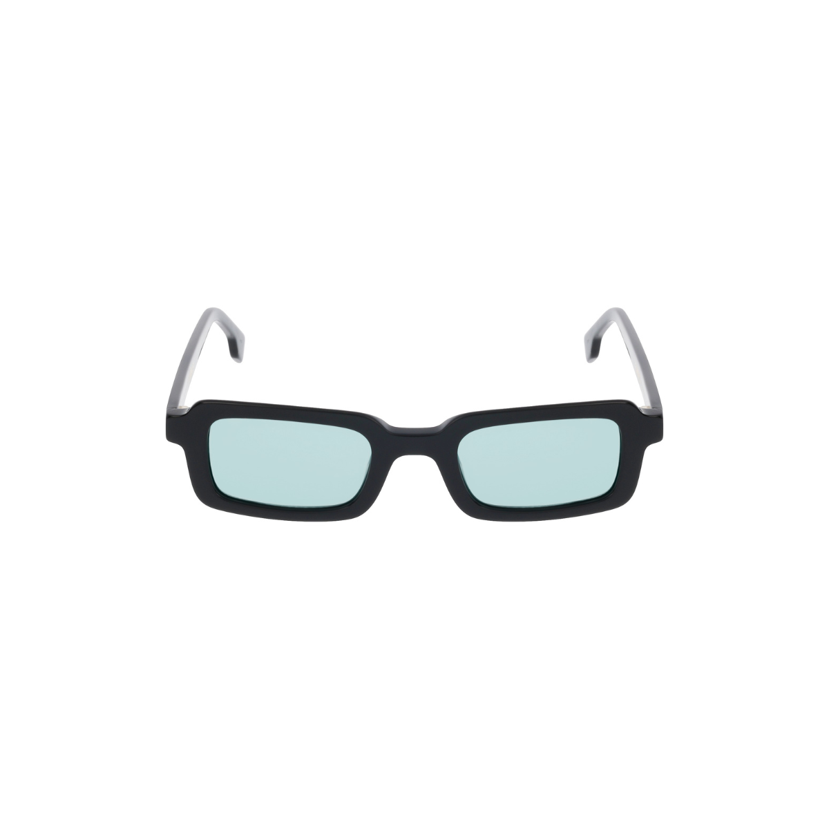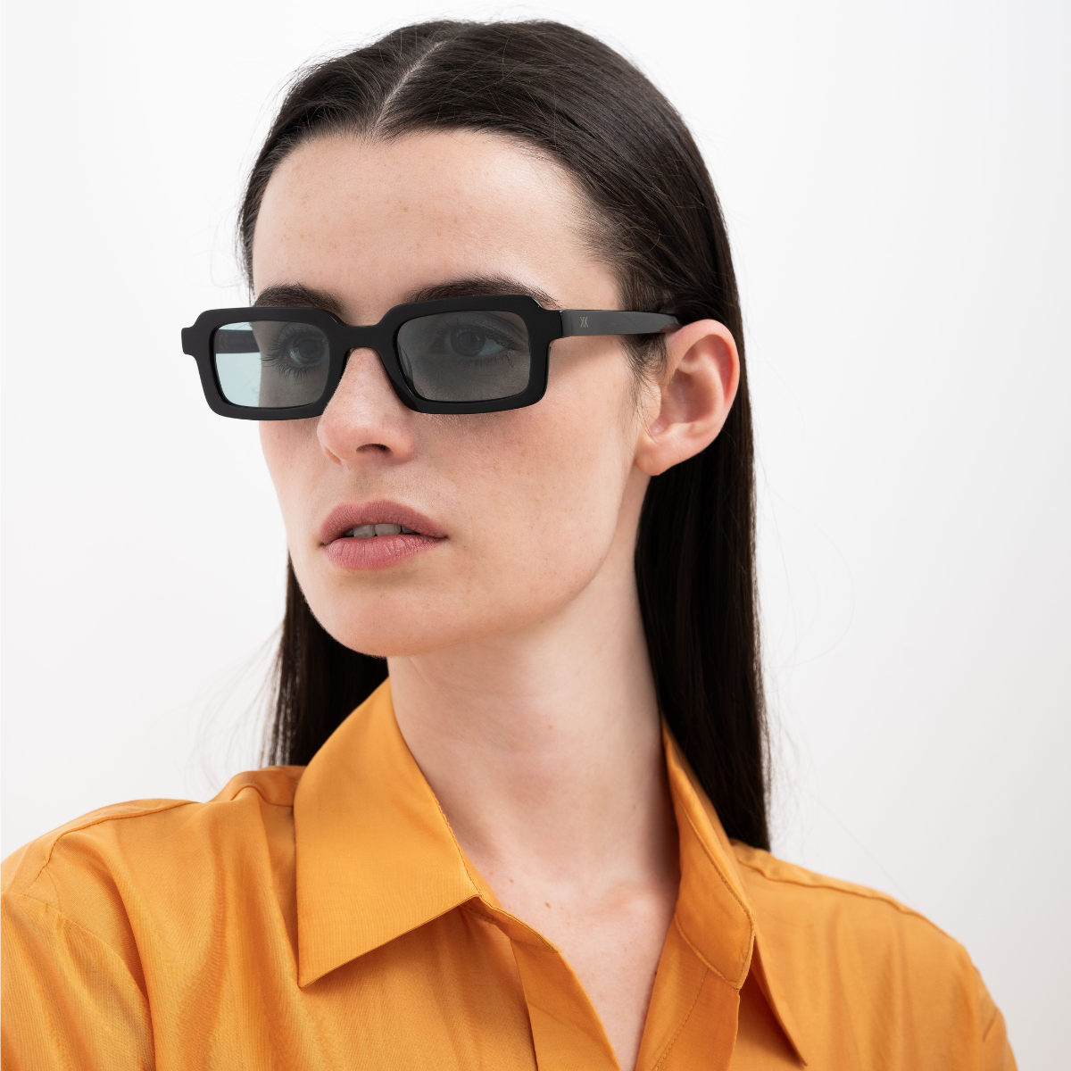 Montura negra brillante con lentes verde sólido (“Solid Green”), que aportan un estilo sobrio, elegante y adaptable a cualquier look.