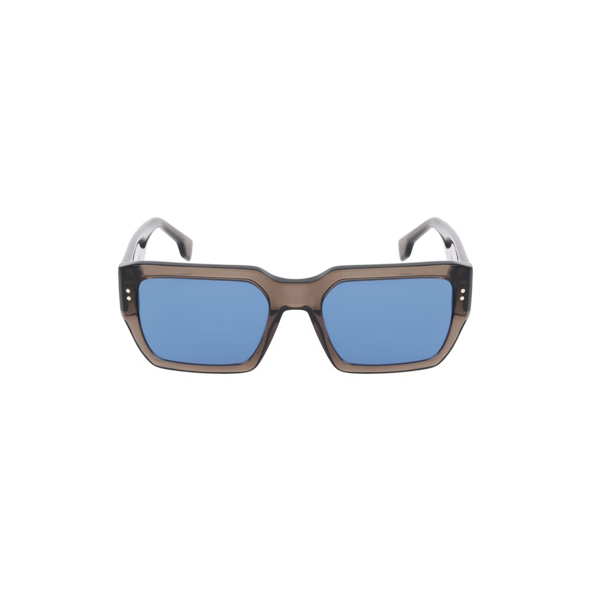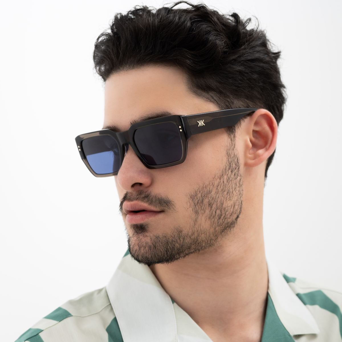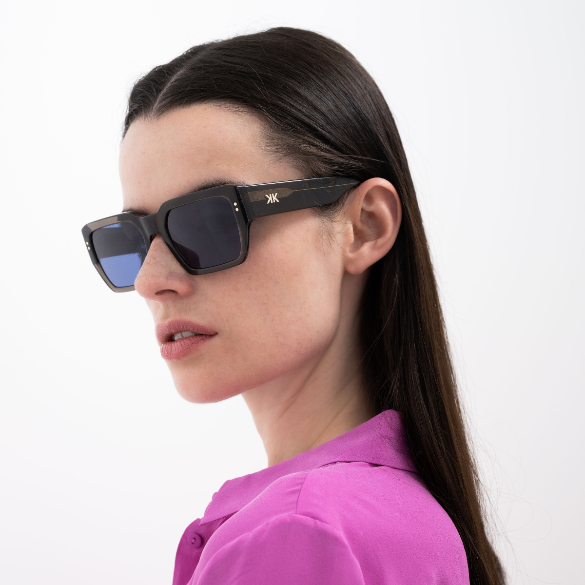 Montura gris transparente con lentes azul marino sólidas (“Solid Navy”), aportando un look clásico y sofisticado.